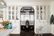 This 120 square meter loft is located on the top floor of the house in Piacenza, Italy and belongs. The ground floor is 81 square meter while a first floor is 42 square meter. The white color is dominating around the floors and hightlights the shadows, the distances and the independent elements like chairs, a sofa, a table and other furniture. When you enter the home you see an open space that seeks a balance between the linearity imposed by the long, parallel main walls. The central table in structural glass (design Romolo Stanco for NIccolai), surrounded by Panton chairs (Verner Panton for Vitra) filters the living room open space in a quiet, understated way, also providing a counterpoint to the sofa. The loft area, which can only be reached by climbing the suspended dinosaur-back like stairs, is the relax-night zone. It is only separated from the living room by a glass that has the same function of theatrical wings. The essential, low bed is opposed to the expressive bathtub (“La vasca” by Matteo Thun).