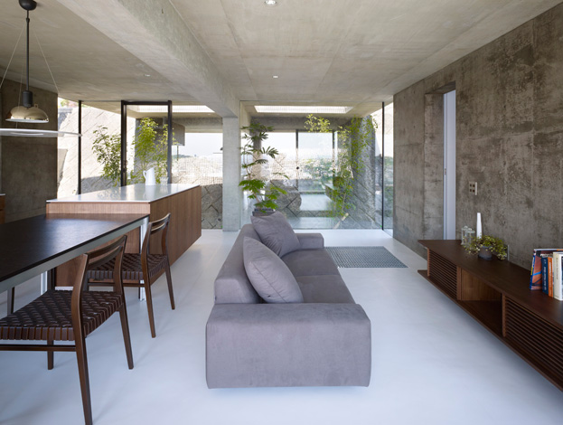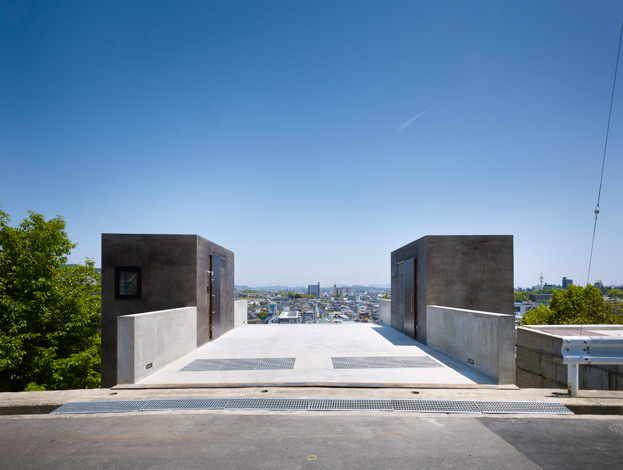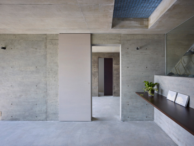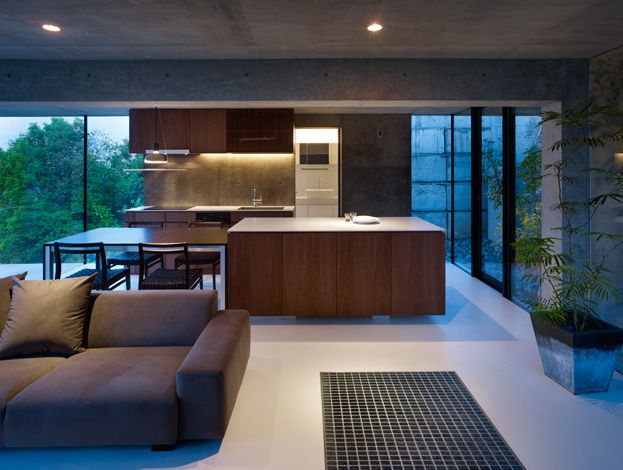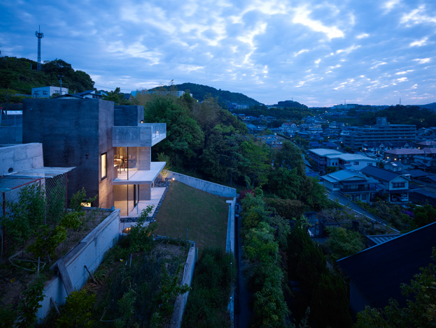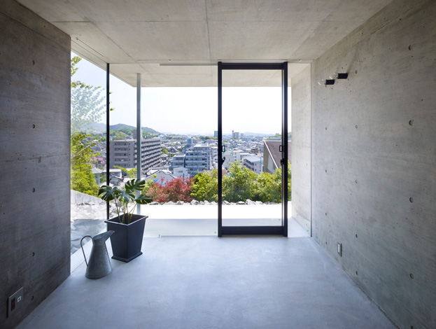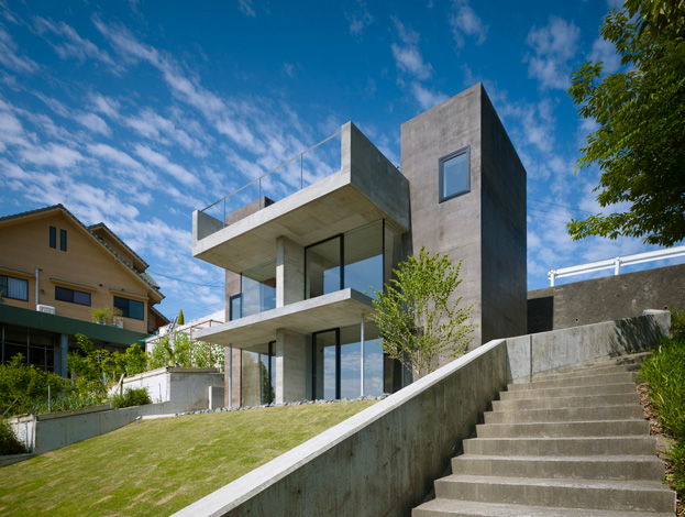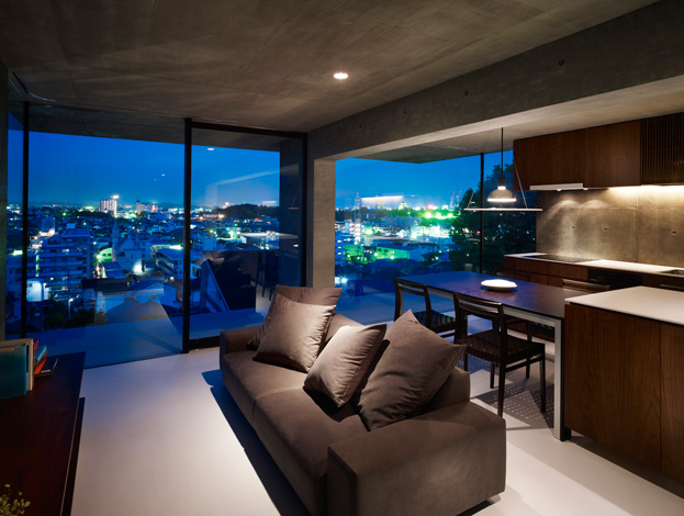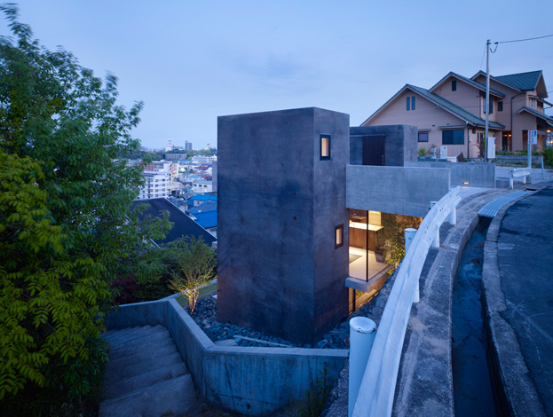 House in Fukuyama is one of the latest works of Japanese design studio Suppose Design, located in Hiroshima, Japan. The house combines traditional for Japanese houses connection of indoors and outdoors with a modern Japanese minimalism. The three storey concrete residence is situated below street level. Two tower stairwells located on the rooftop are entrances to the building. Below the entrances are all private and public spaces some of wich are connected with a terrace. Thanks to large glazings and vertical orientation of the house almost all rooms features truly amazing city views. The interior is done as combination of raw concrete with wood furniture. Everything inside looks as minimalist as outside.